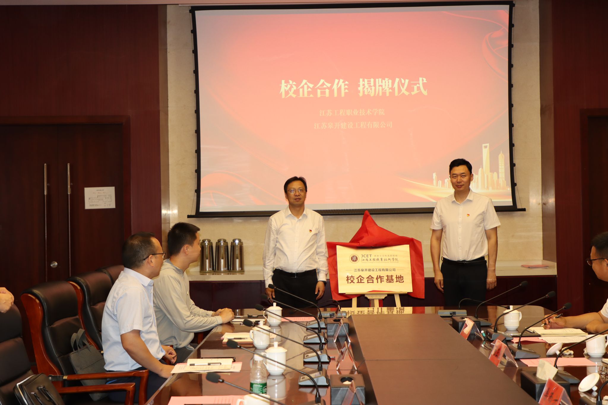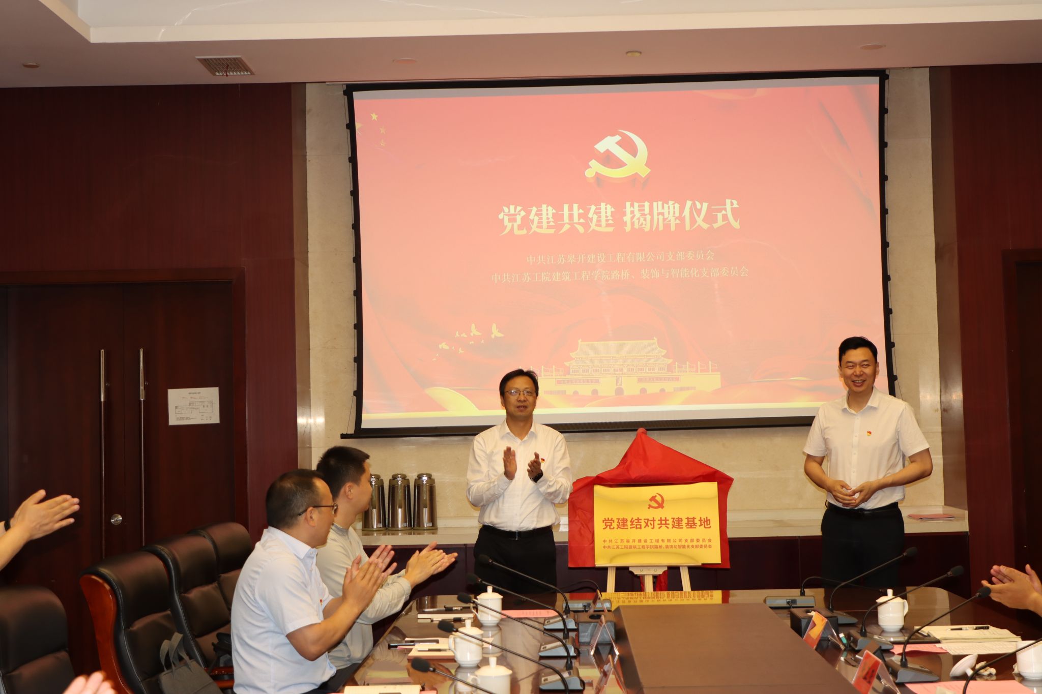 与会双方就学生实习就业、教师互聘、技术服务等内容进行了充分交流并达成诸多共识。在双方的共同见证下,杨化奎与江苏皋开建设工程有限公司党支部书记、总经理张正亚签署了党支部共建协议和校企合作协议,张忠与桑西方共同为党建共建基地及校企合作实训基地揭牌。
