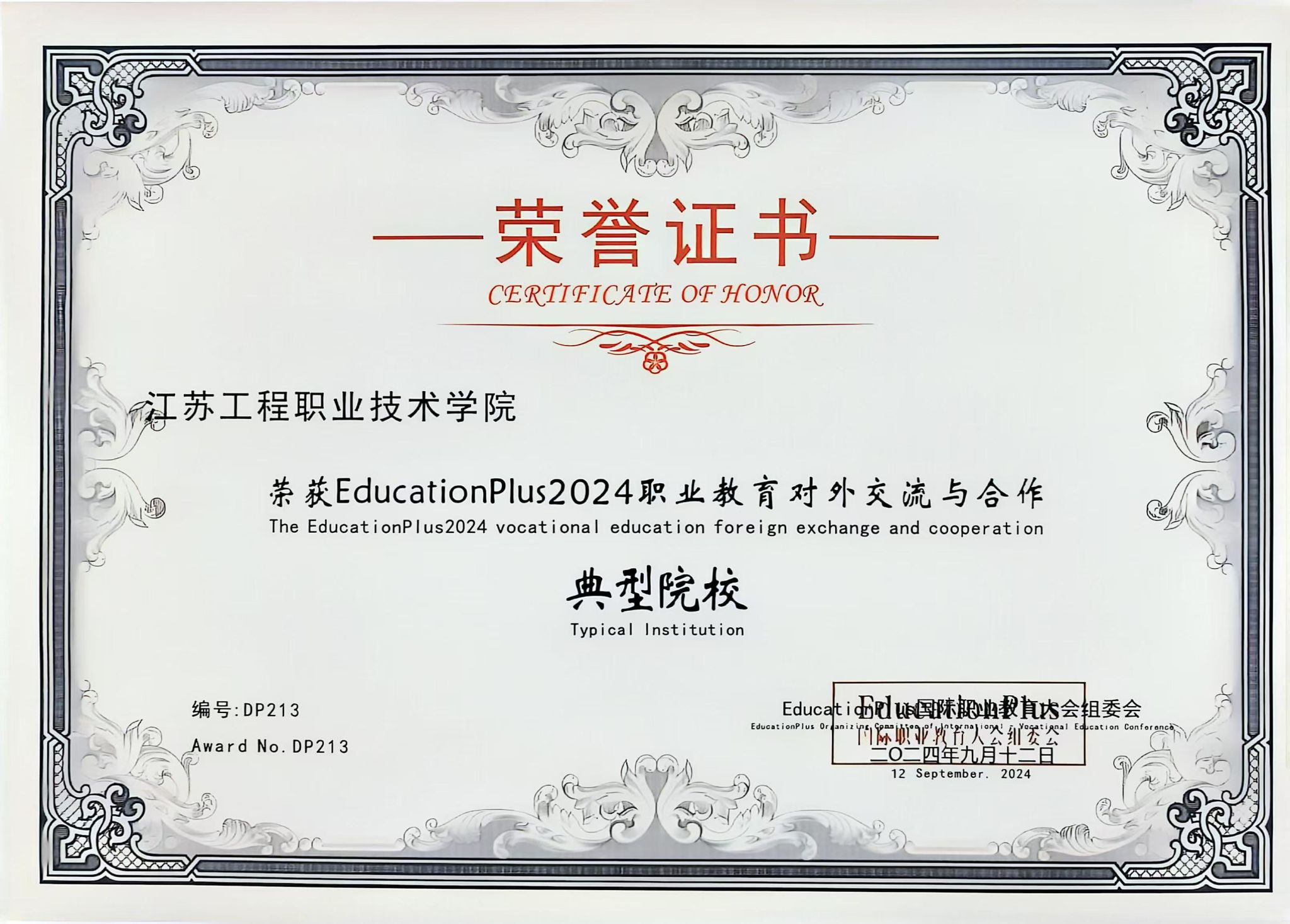 我校荣获EducationPlus2024职业教育对外交流与合作典型院校